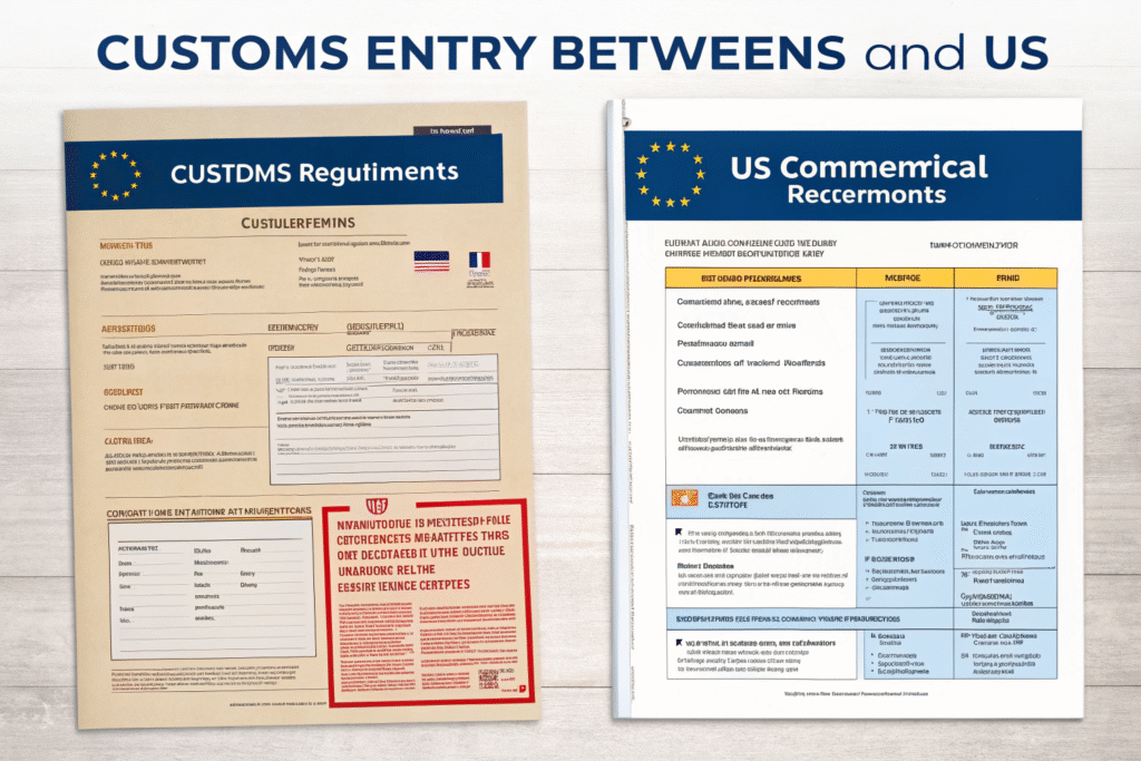 US has unique partner government agency requirements. The US requires specific forms like FDA prior notice, USDA permits, and CPSC certificates that have no direct EU equivalents.