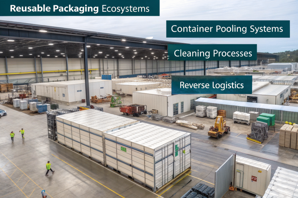 Container pooling systems reduce individual company investment. Similar to pallet pooling, companies like Loop and Returnity create shared container systems that circulate among multiple users, spreading costs and maximizing utilization.