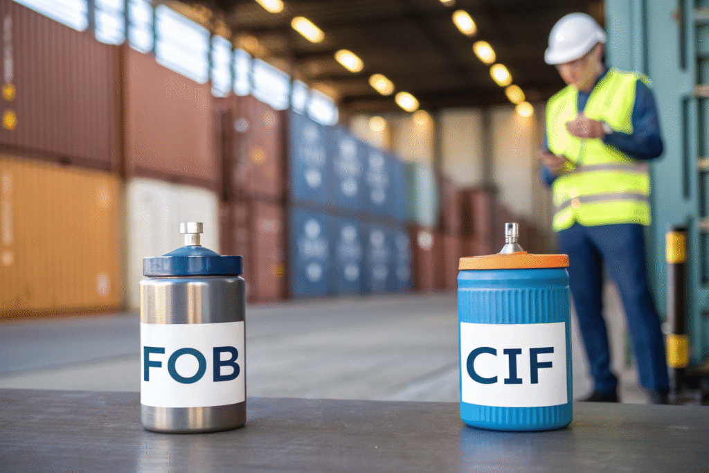 FOB (Free on Board) means the seller handles delivery up to the port of departure, while CIF (Cost, Insurance, Freight) includes ocean transport and insurance paid by the seller.